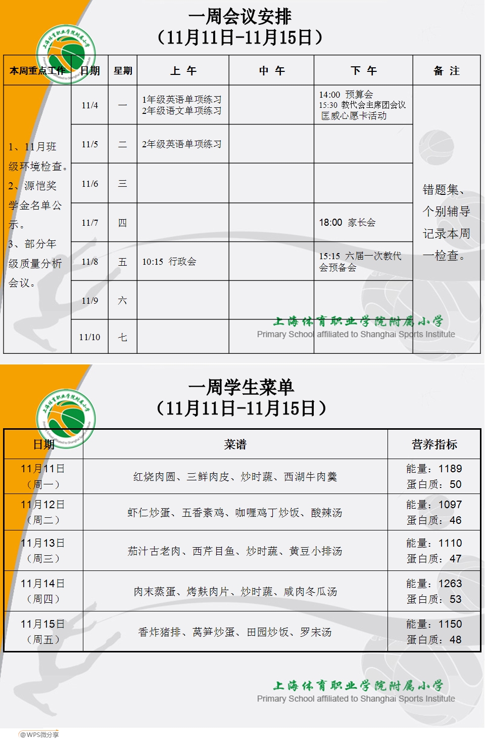 一周会议安排及学生菜单、课程表公告、作业公示、晒课后服务课表
