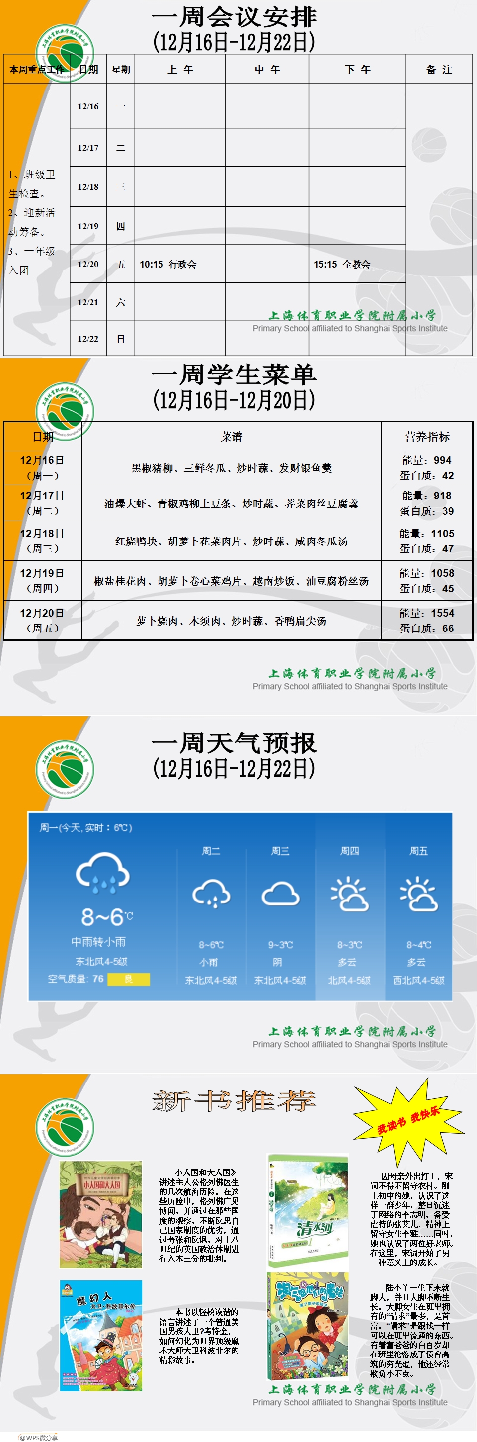 一周会议安排及学生菜单(12.16-12.22)
