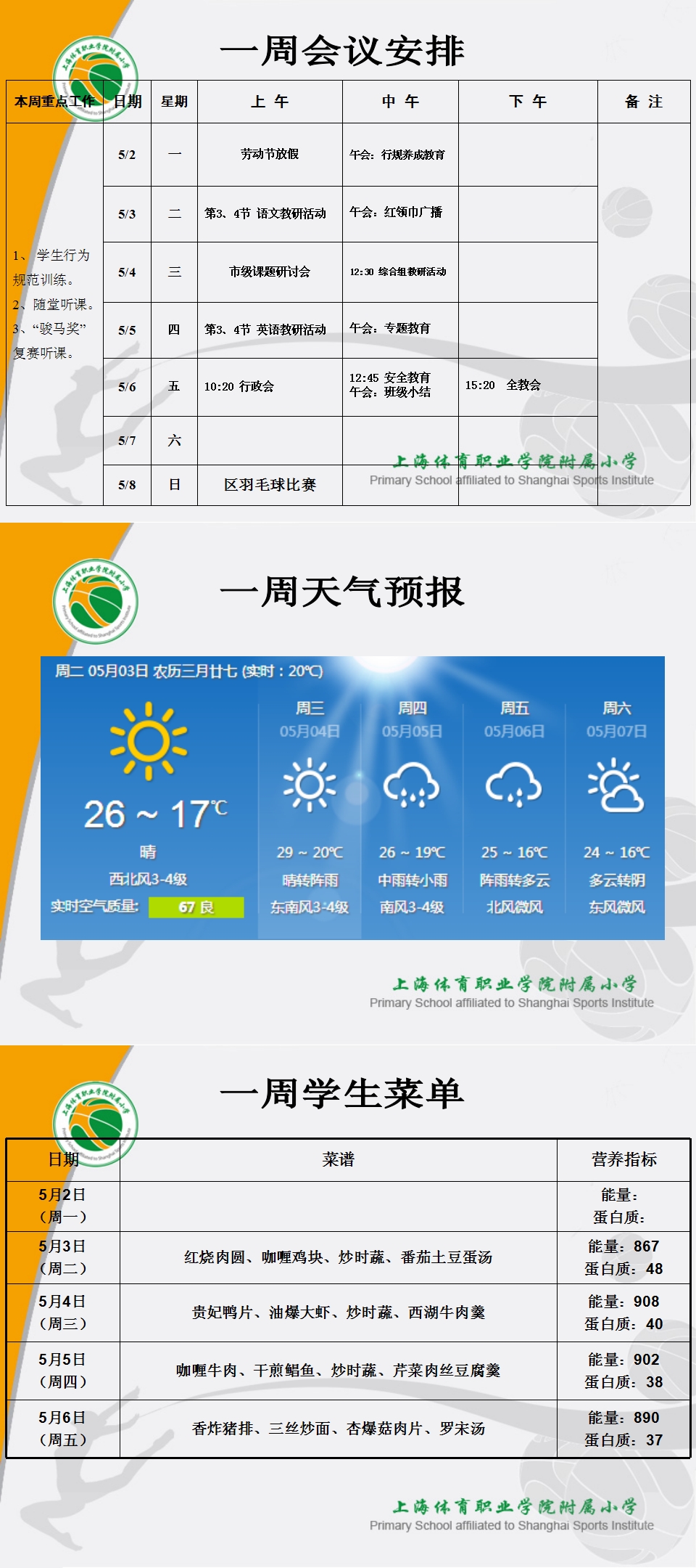 一周会议安排及学生菜单、课程表公告、作业公示、晒课后服务课表